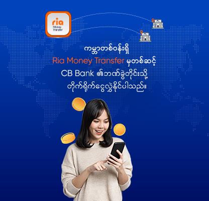 ကမ္ဘာတစ်ဝန်းရှိ Ria Money Transfer မှတစ်ဆင့် CB Bank ၏ ဘဏ်ခွဲတိုင်းသို့ တိုက်ရိုက်ငွေလွှဲနိုင်ပါသည်။