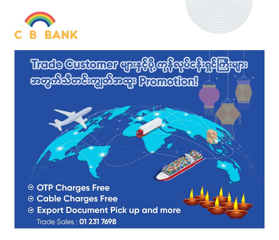 CB Bank ၏ Trade Customer များနှင့် ပို့ကုန်လုပ်ငန်းရှင်ကြီးများအတွက် သီတင်းကျွတ်အထူး Promotion!