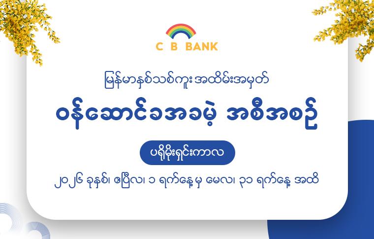 CB Bank ရဲ့ မိတ်ဟောင်းမိတ်သစ် Customer များအပေါ် ကျေးဇူးတုံ့ပြန်တဲ့အနေနဲ့ အောက်ဖော်ပြပါ ဘဏ်ဝန်ဆောင်မှုတွေကို အခမဲ့ ဆောင်ရွက်နိုင်မဲ့အကြောင်း သတင်းကောင်းပါးလိုက်ပါတယ်။