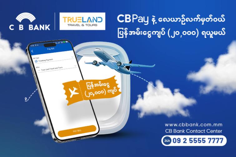 ၂၀၂၆ ခုနှစ်၊ ဇန်နဝါရီလ၊ ၁၉ ရက်မှ ဖေဖော်ဝါရီလ၊ ၁၉ ရက်နေ့အတွင်း True Land Travel & Tours မှာ International Flight Ticket ဝယ်ယူပြီး CB Pay မှတစ်ဆင့် ငွေပေးချေရုံနဲ့ ပြန်အမ်းငွေ (၂၀,၀၀၀)ကျပ် ရယူနိုင်ပါပြီ။